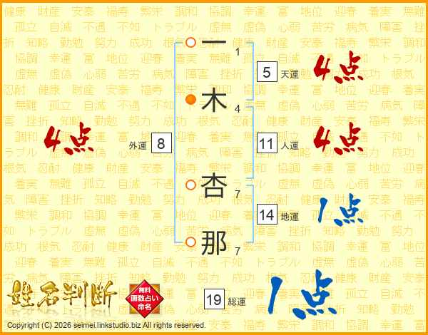 生活面を象徴する運勢です。外部から受ける影響力を表し、結婚運、家庭運や職場、環境への順応性を表します。総運から人運を引いた画数。姓や名が1文字の場合を除く。