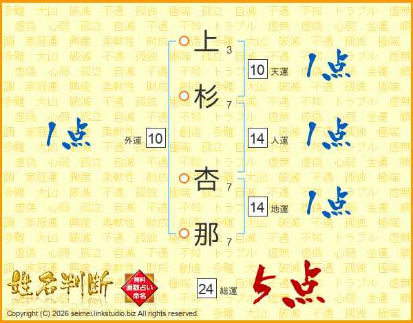 生活面を象徴する運勢です。外部から受ける影響力を表し、結婚運、家庭運や職場、環境への順応性を表します。総運から人運を引いた画数。姓や名が1文字の場合を除く。