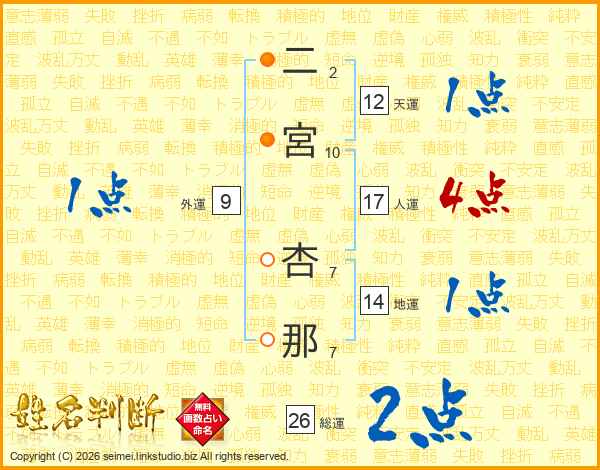 生活面を象徴する運勢です。外部から受ける影響力を表し、結婚運、家庭運や職場、環境への順応性を表します。総運から人運を引いた画数。姓や名が1文字の場合を除く。