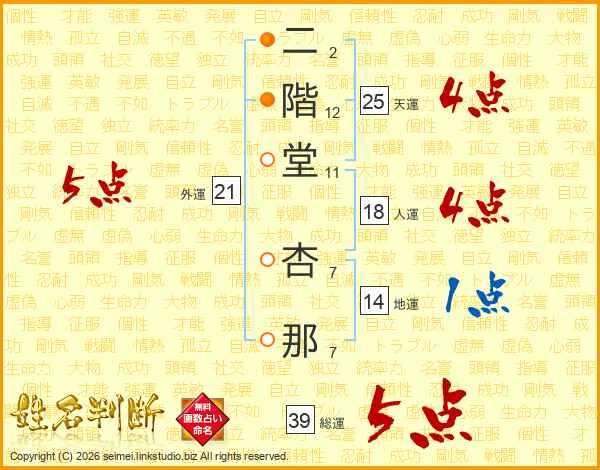 二(2画)階(12画)堂(11画) 杏(7画)那(7画)