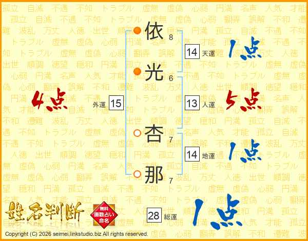 依(8画)光(6画) 杏(7画)那(7画)