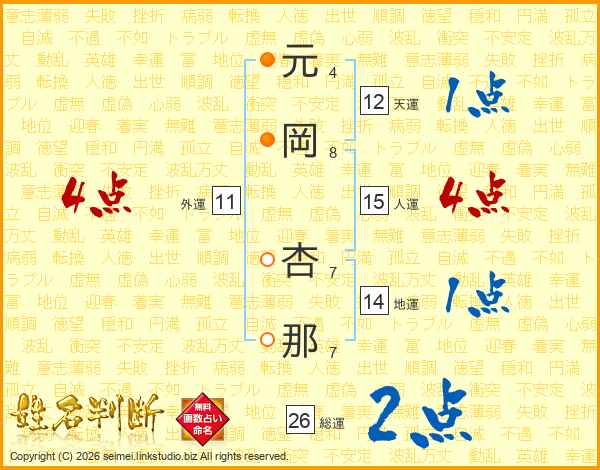 元岡杏那さんの総運は26画の2点!