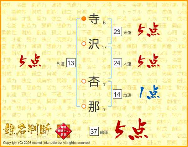 寺(6画)沢(17画) 杏(7画)那(7画)