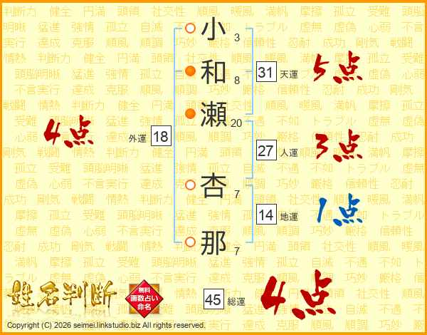 小(3画)和(8画)瀬(20画) 杏(7画)那(7画)