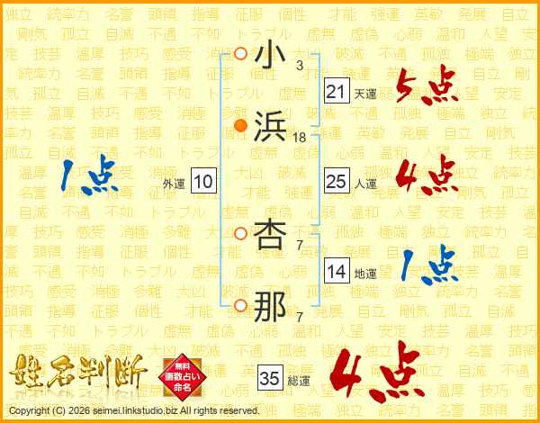 小浜杏那さんの総運は35画の4点!