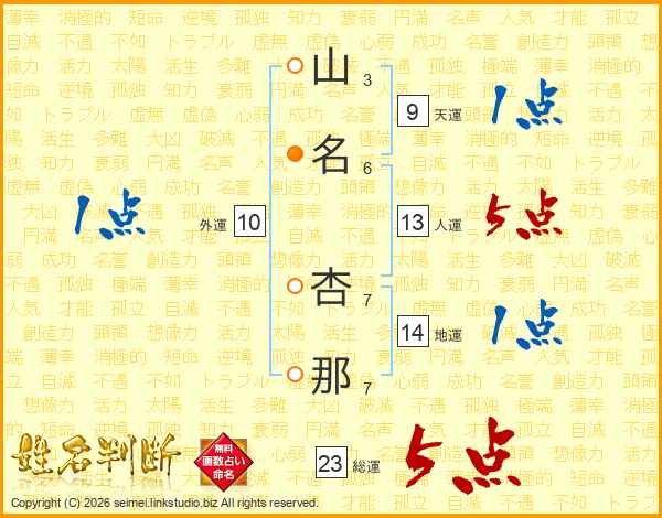 生活面を象徴する運勢です。外部から受ける影響力を表し、結婚運、家庭運や職場、環境への順応性を表します。総運から人運を引いた画数。姓や名が1文字の場合を除く。