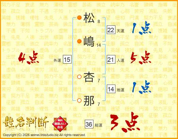 松(8画)嶋(14画) 杏(7画)那(7画)