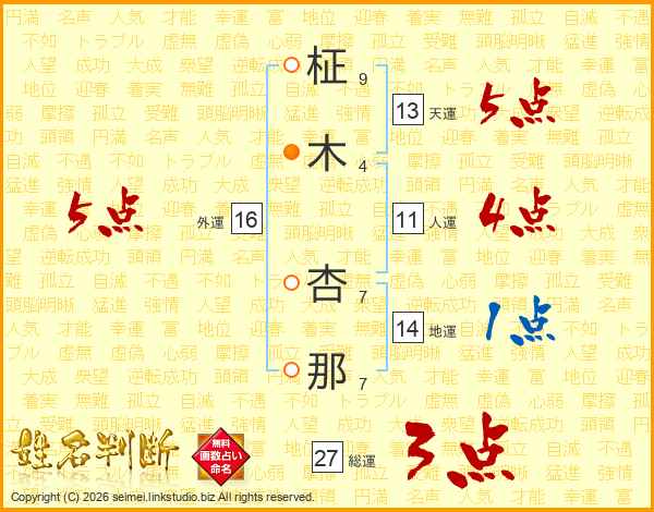 柾(9画)木(4画) 杏(7画)那(7画)