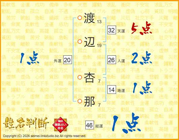 渡(13画)辺(19画) 杏(7画)那(7画)