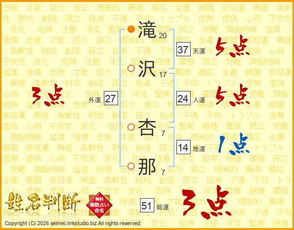 滝沢杏那さんの天運は37画の5点!