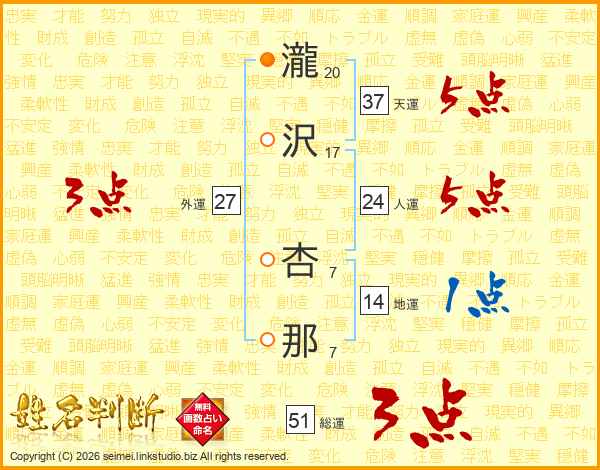 瀧沢杏那さんの天運は37画の5点!