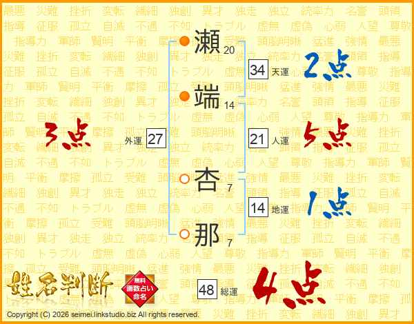 瀬端杏那さんの総運は48画の4点!