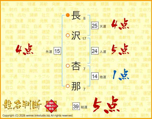 長沢杏那さんの総運は39画の5点!