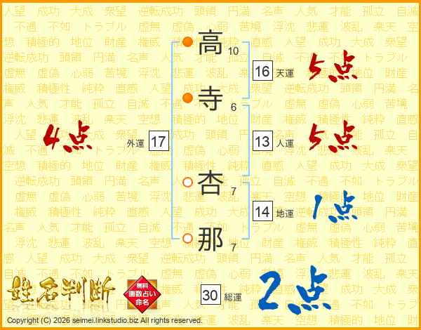 高(10画)寺(6画) 杏(7画)那(7画)