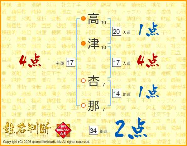生活面を象徴する運勢です。外部から受ける影響力を表し、結婚運、家庭運や職場、環境への順応性を表します。総運から人運を引いた画数。姓や名が1文字の場合を除く。