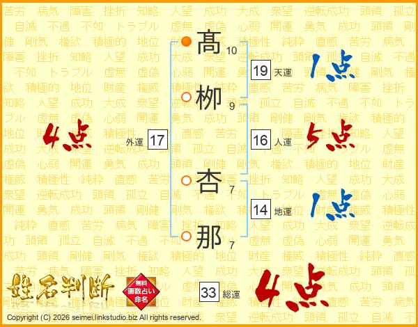 髙栁杏那さんの総運は33画の4点!