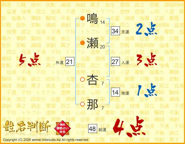 鳴(14画)瀬(20画) 杏(7画)那(7画)