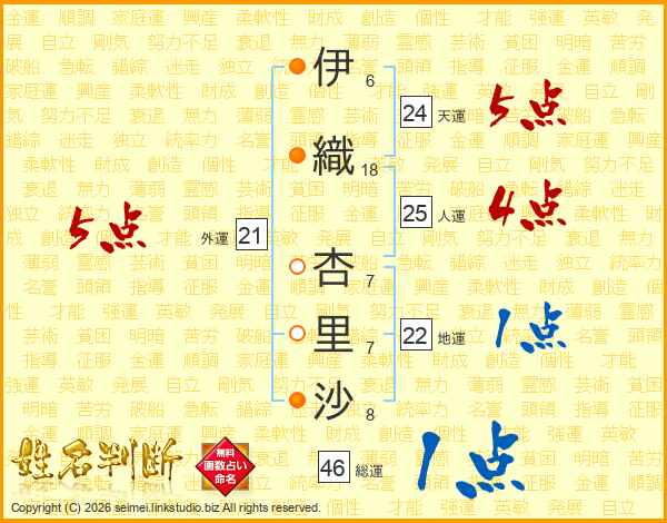 伊(6画)織(18画) 杏(7画)里(7画)沙(8画)