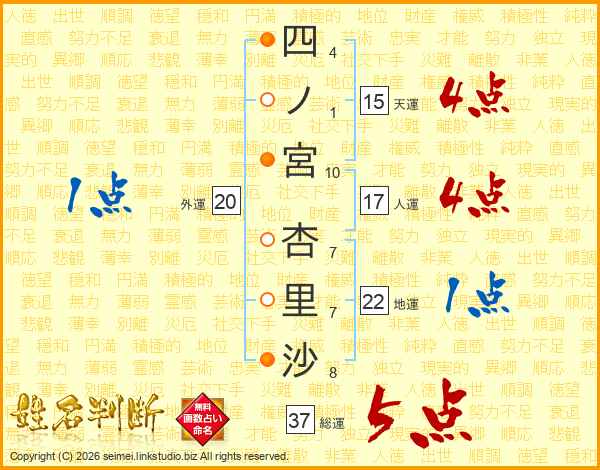 四(4画)ノ(1画)宮(10画) 杏(7画)里(7画)沙(8画)