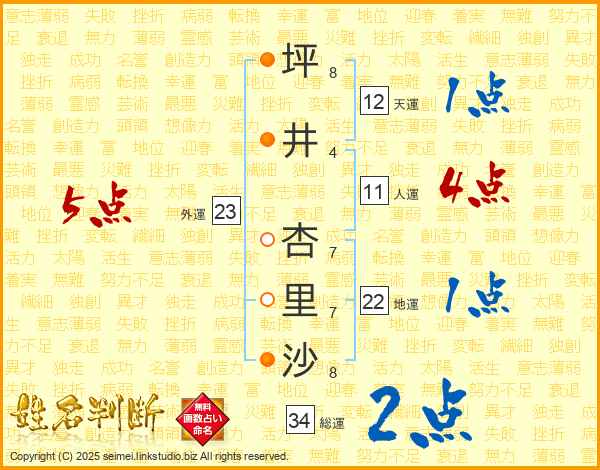 坪(8画)井(4画) 杏(7画)里(7画)沙(8画)