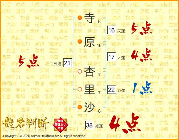 寺(6画)原(10画) 杏(7画)里(7画)沙(8画)