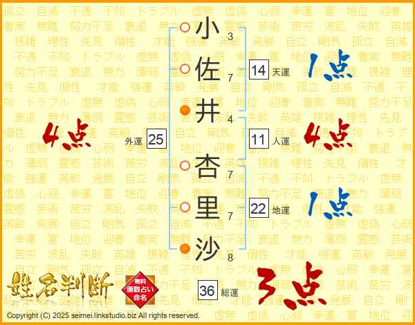 小(3画)佐(7画)井(4画) 杏(7画)里(7画)沙(8画)