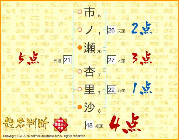 市(5画)ノ(1画)瀬(20画) 杏(7画)里(7画)沙(8画)