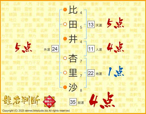 比(4画)田(5画)井(4画) 杏(7画)里(7画)沙(8画)