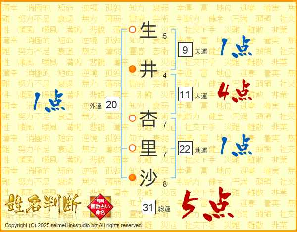 生(5画)井(4画) 杏(7画)里(7画)沙(8画)