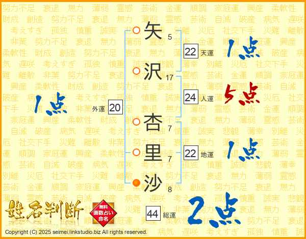 矢(5画)沢(17画) 杏(7画)里(7画)沙(8画)