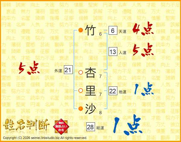竹杏里沙さんの外運は21画の5点!
