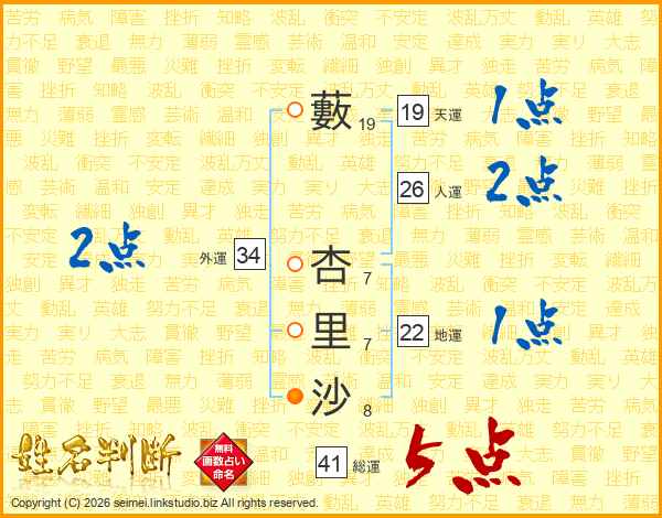 藪杏里沙さんの総運は41画の5点!