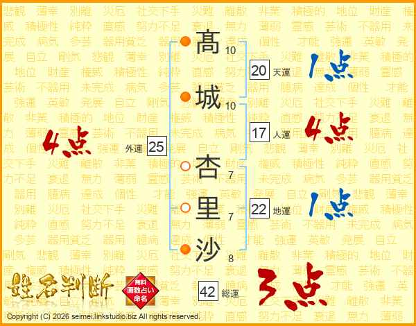 髙(10画)城(10画) 杏(7画)里(7画)沙(8画)