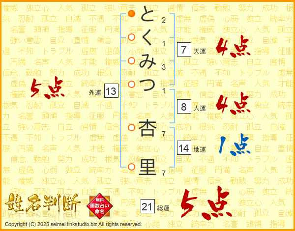 とくみつ杏里さんの総運は21画の5点!
