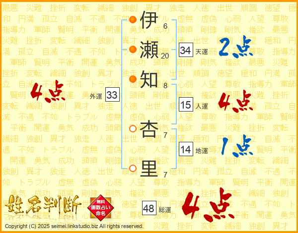 伊(6画)瀬(20画)知(8画) 杏(7画)里(7画)