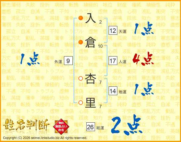 入倉杏里さんの総運は26画の2点!