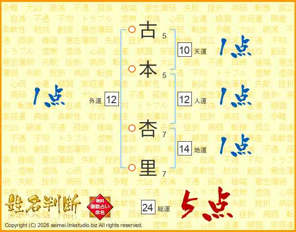 画数の奇数(○陽)と偶数(●陰)の配列で吉凶を占います。どちらかにかたよる名前は大凶名で避ける必要があります。画数の奇数偶数。