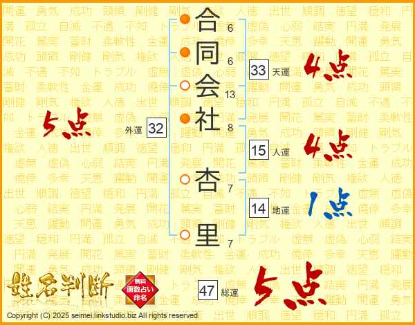 合(6画)同(6画)会(13画)社(8画) 杏(7画)里(7画)