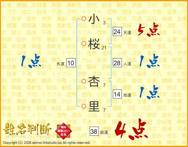小桜杏里さんの総運は38画の4点!