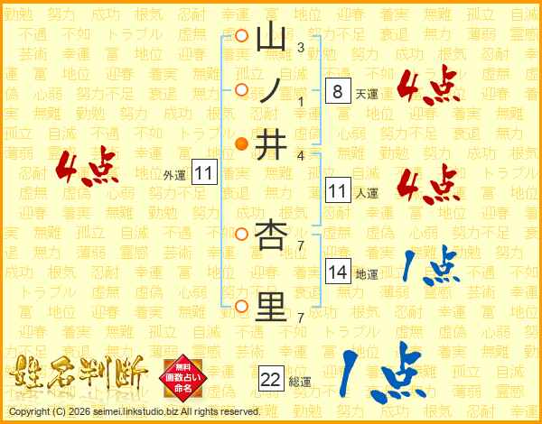 山(3画)ノ(1画)井(4画) 杏(7画)里(7画)