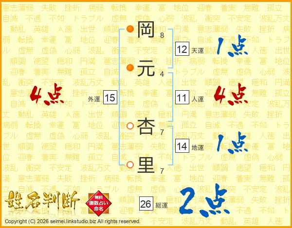 岡(8画)元(4画) 杏(7画)里(7画)