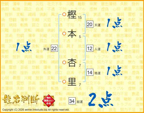 あなたの人生を表す1番重要な運勢です。生涯を通じて影響する総合運となり、主に50歳以降の晩年期に影響を及ぼします。苗字と名前の合計画数。