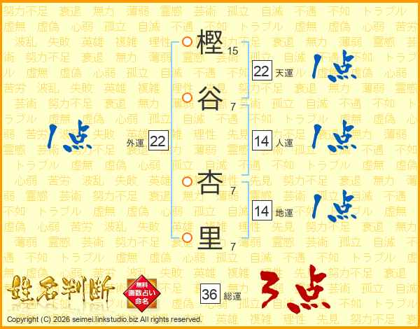 樫(15画)谷(7画) 杏(7画)里(7画)