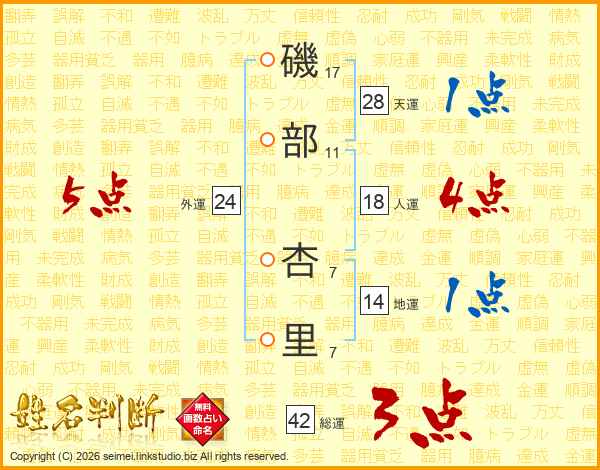生活面を象徴する運勢です。外部から受ける影響力を表し、結婚運、家庭運や職場、環境への順応性を表します。総運から人運を引いた画数。姓や名が1文字の場合を除く。
