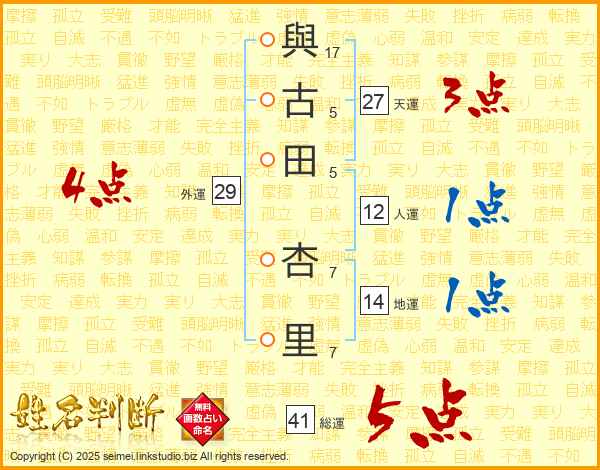 與(17画)古(5画)田(5画) 杏(7画)里(7画)