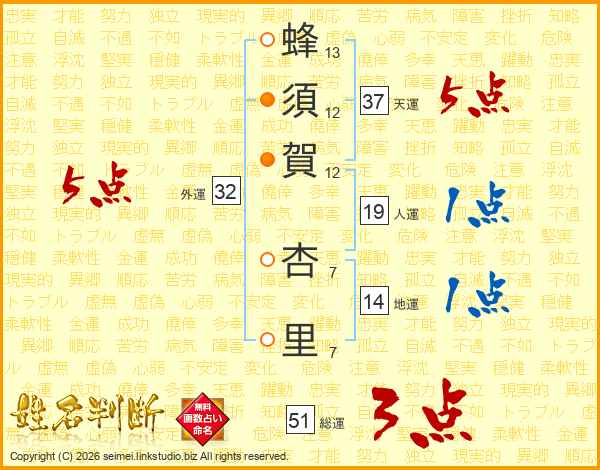 蜂須賀杏里さんの総運は51画の3点!