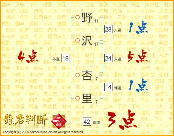 野(11画)沢(17画) 杏(7画)里(7画)