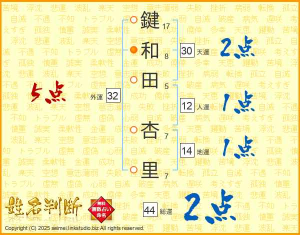 鍵(17画)和(8画)田(5画) 杏(7画)里(7画)