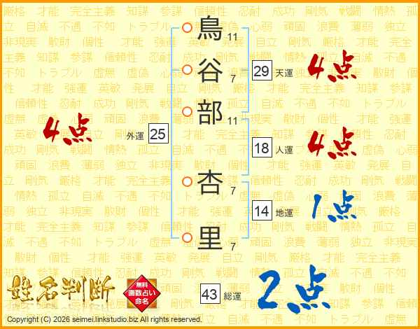 鳥(11画)谷(7画)部(11画) 杏(7画)里(7画)