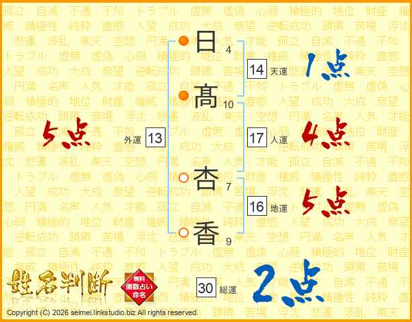 日(4画)髙(10画) 杏(7画)香(9画)